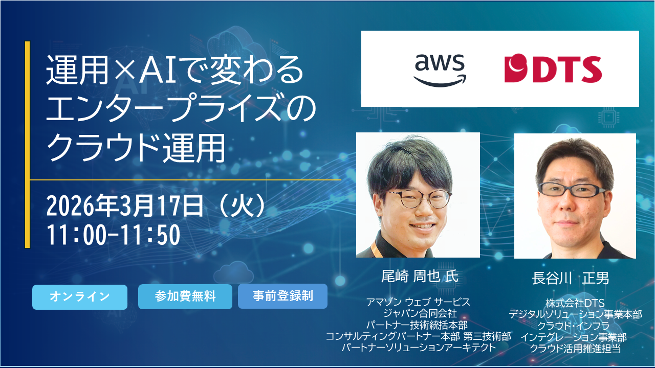 | 講演内容 | 本ウェビナーでは、クラウド運用における属人化・工数増大・体制不足といった課題に対し、AWSの具体機能に落とし込んだ運用×AIのサイクルを、現場で回る形に落とし込む方法を解説します。 ここでいうAIとは、単なる自動化やツール導入ではなく、AWS上に蓄積されるログ・メトリクス・ルール・過去事例を横断し、判断・整理・優先付けを支援する仕組みを指します。 技術紹介に留まらず、なぜ定着しないのか/どうすれば続くのかという現場視点のノウハウを、成功・失敗の両面から共有します。 |