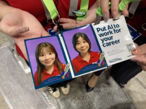 参加者は顔写真を撮影するだけで、AIがポップな「コミック風」の自画像に変換。すぐにストラップ付きのオリジナルバッチとして手渡され、参加者間のコミュニケーションツールとしても活用されていました。