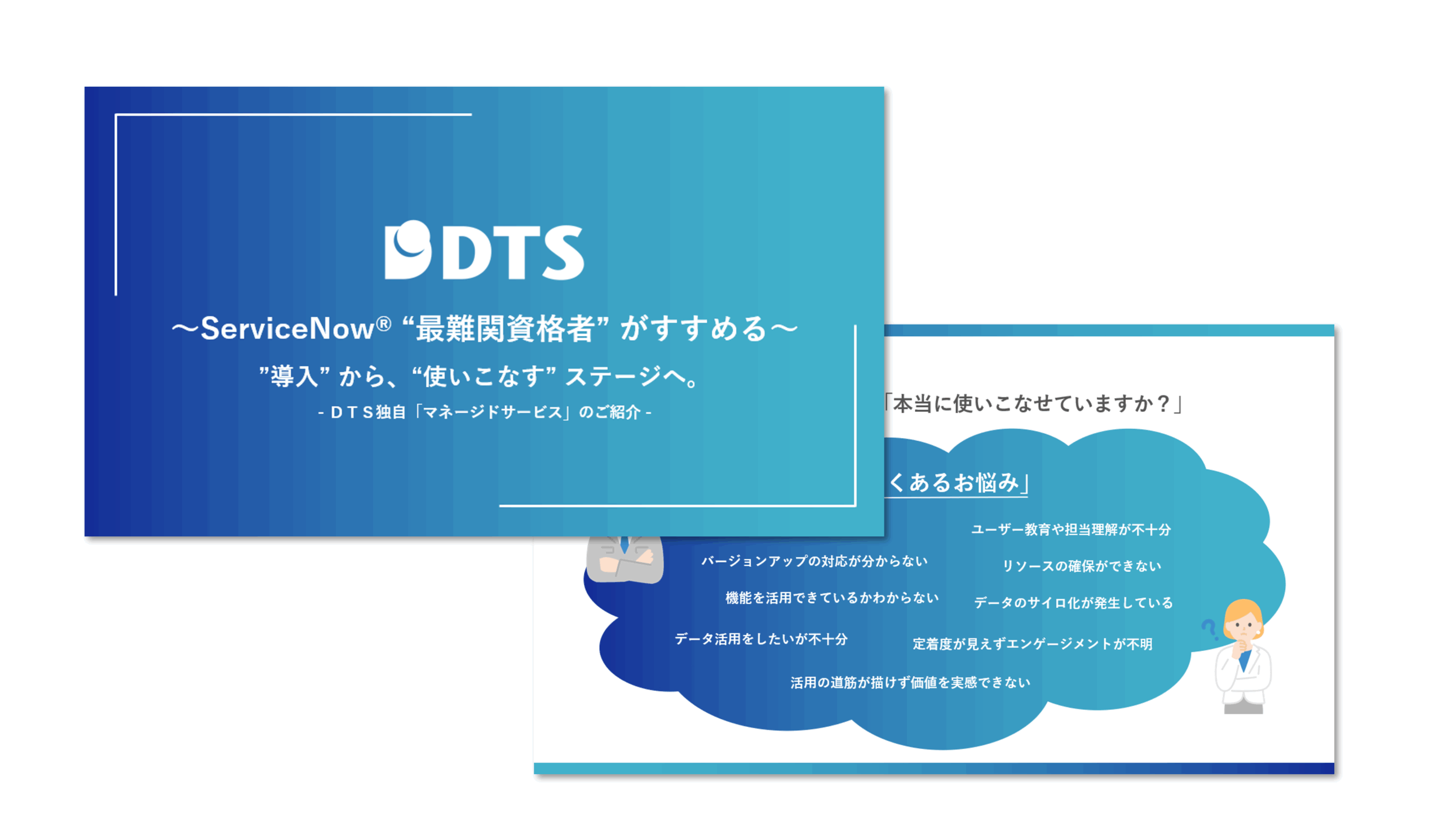 ServiceNow は導入すること自体が目的ではなく、継続的に活用し、その価値を最大化してこそ真価を発揮します。一方で、導入後に「使いこなせているのか分からない」「運用や人材面で課題が残る」といった悩みを抱える企業は少なくありません。こうした課題に対し、DTSではServiceNow最高峰資格「CTA」認定者の知見を活かした独自のマネージドサービスを提供しています。本資料では、ServiceNow を取り巻く典型的な課題を整理するとともに、"導入"から”使いこなす”ステージへ、DTSの支援アプローチについてご紹介します。